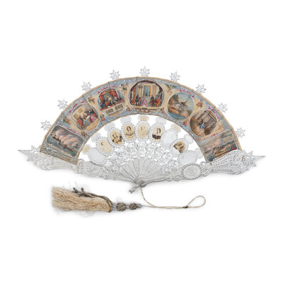 RARE: Only four examples of this fan type are currently known; this example is one of three recorded specimens executed in aluminum, a material considered a precious metal at the time and reserved for luxury and commemorative objects. One recorded example survives with wooden sticks rather than metal. Another, produced for Central America and associated with women’s self-defense, is an extreme variant incorporating a hidden, retractable knife blade and a small hinged compartment for poison. A third example, made for the United States market, substitutes portraits of Union generals on the leaf and likewise differs materially in having wooden sticks instead of aluminum.