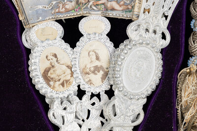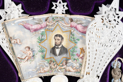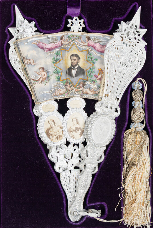Opened, 22 x 10 in., formed by eleven silver-sparkled and incised decorative cast aluminum rods, each with an oval medallion and embellished with federal eagles. The oval medallions contain small albumen photos of European queens (lacking three) and their names (lacking nine). Two oval medallions are embossed with the arms of Cuba and France. The sticks are further embellished with medallions featuring American eagles, which terminate in a star at the top. A large tassel hangs from the apex of the fan. The fan itself is adorned with fabric 3" in width with scenes from the Civil War and the assassination.