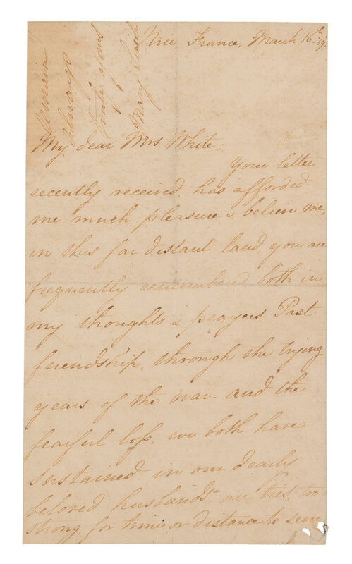Five months after sailing to Europe, Mrs. Lincoln writes to her friend Mrs. White, who had been widowed in 1867: "...Past friendship, through the trying years of the war---and the fearful loss, we have both sustained in our dearly beloved husbands, are des, too strong, for time or distance to sever..." She explains that she has come to the Riviera for her health, leaving her son Tad at his studies in Frankfurt: "I find myself regaining strength. For sorrow, such as ours, there is no balm, the grave and Heaven, with reunion with our loved ones can alone heal, bleeding, broken hearts. Wherever I am, feeling so sadly, I lead a life of isolation & retirement, although I have been here several weeks, I am sure few or none are aware of it..."