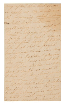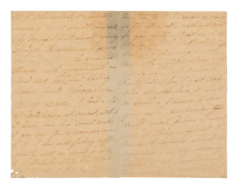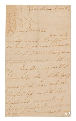 She suggests that Mrs. White join her on an excursion to Italy: "We could visit places of interest without being recognized. Of course, Americans abound everywhere---& in my morning walks in the sunshine, you can always recognize them, very often by their loud voices, so early as ten or eleven in the morning, velvet costumes &---Full dress, when one is sight seeing or in quest of health & change, must certainly be a trial. After we have suffered heavy afflictions, life is at best a fearful endurance. To me every thing looks so desolate. I often wonder why, I was spared, when my darling husband was taken, and to suffer so much too!..."