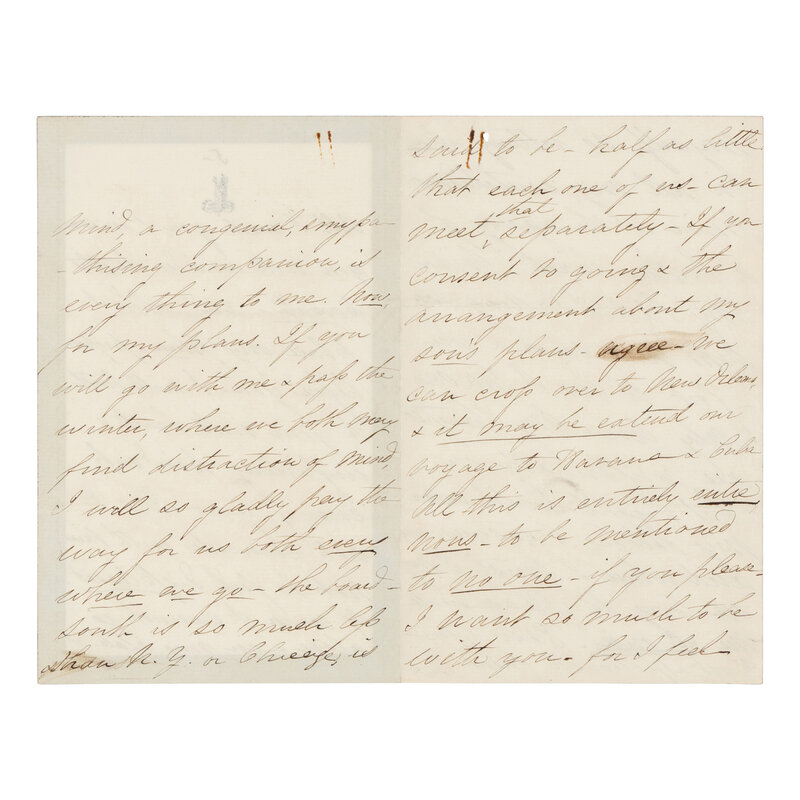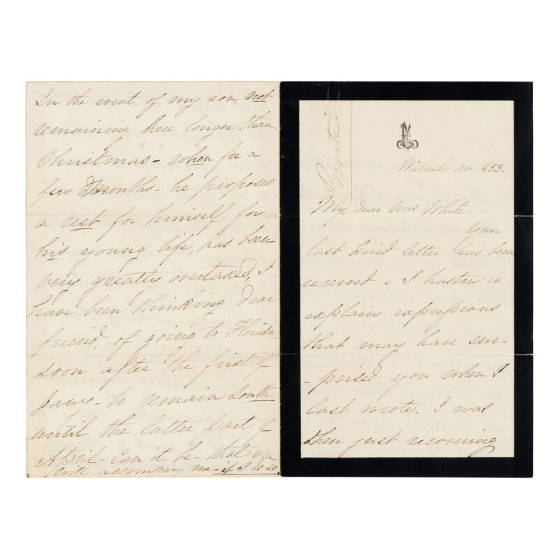 In part: "I have been thinking, dear friend, of going to Florida soon after the first of January - to remain south until the latter part of April. Can it be that you will accompany me... Of course, I cannot go alone and in my state of mind, a congenial, sympathizing companion is every thing to me. Now, for my plans. If you will go with me and pass the winter...I will so gladly pay the way for us both every where we go... If you please. I want so much to be with you, for I feel myself so utterly alone in all my wretchedness. Mine is the agony of a broken heart. Without my blessed, darling son, who was such a comfort to me, I can scarcely live..."