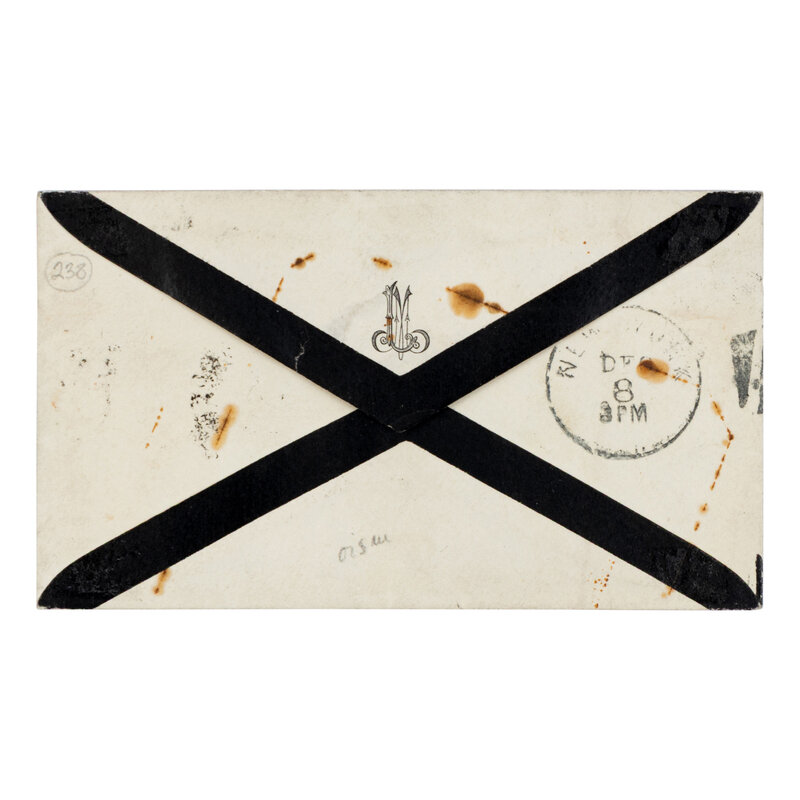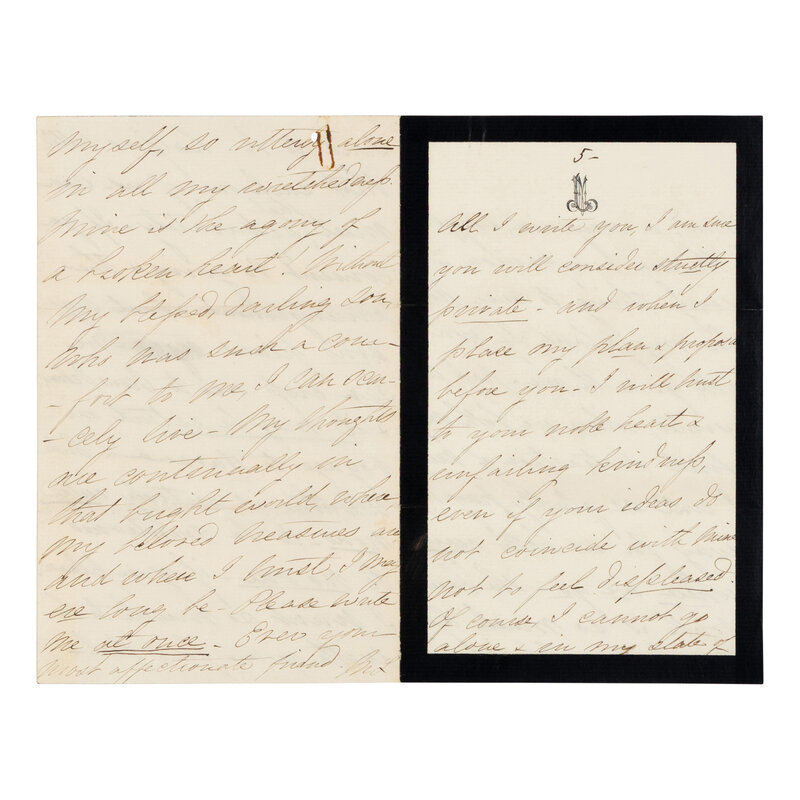 8pp., 8vo (178 x 114 mm), on black-bordered mourning stationery with personal monogram, accompanied by original black-bordered envelope with personal monogram and free frank, "Mary Lincoln," paperclip residue to four pages.