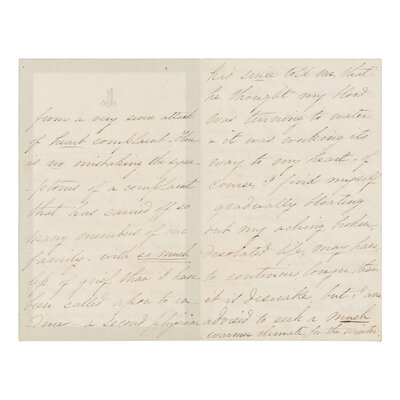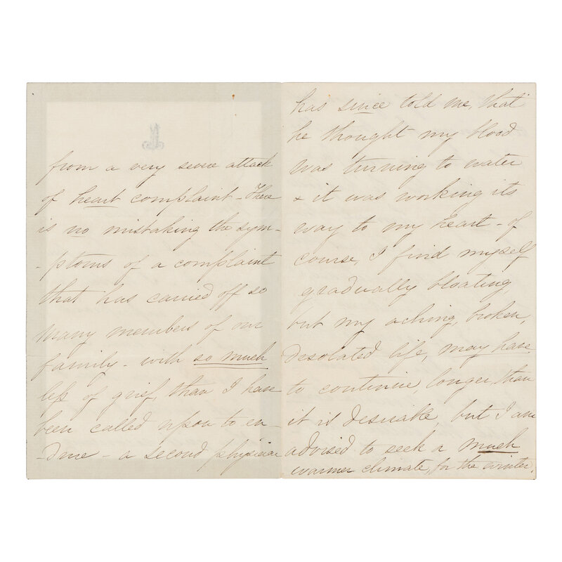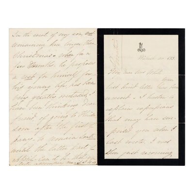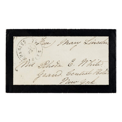 Mary Lincoln returned to the United States from Europe with her son, Tad, in May 1871, and two months later, Tad unexpectedly passed away at his brother Robert's home in Chicago. Having now suffered the loss of three sons and her husband, her mental health began to rapidly deteriorate. For the next four years, she traveled extensively through the United States and Canada in an effort to distract from her grief. During this time, she increasingly relied on her dwindling circle of old friends, among them Rhoda White, for emotional support. The present letter describes her poor health and her desperation to avoid the cold Chicago winter, inviting her old friend to join her and speaking of her grief following the death of her son, Tad.