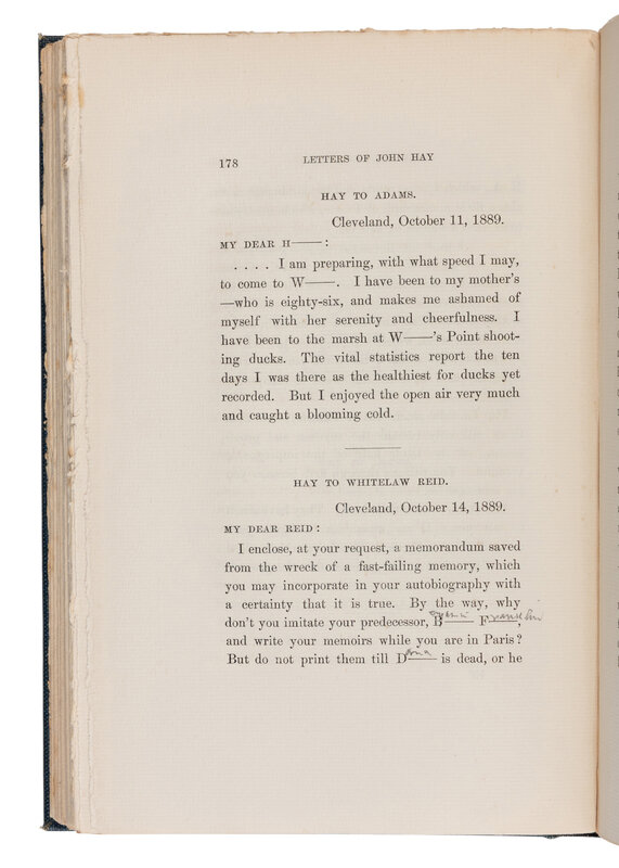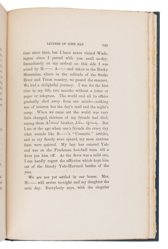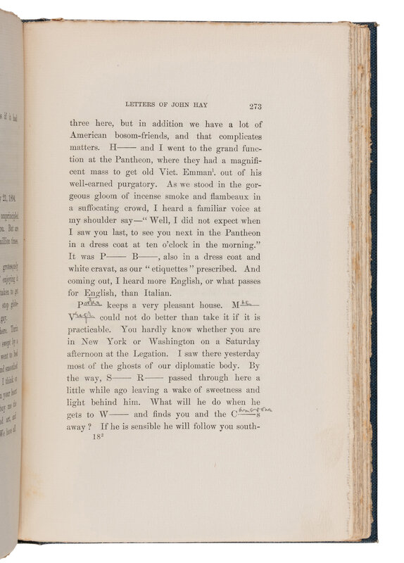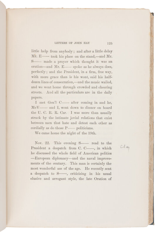 ROBERT TODD LINCOLN'S COPY, WITH ANNOTATIONS IN HIS HAND, identifying several names to the redacted portions. Presumably gifted to him by Hay's widow. This edition was one of a small number of copies privately printed for distribution among friends of the Hay family.