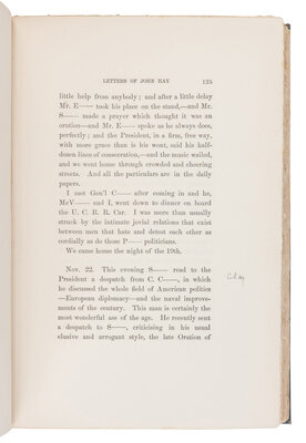 Following Lincoln's death, Hay distinguished himself as a statesman as Assistant Secretary of State under Rutherford B. Hayes and James Garfield, the U.S. Ambassador to the United Kingdom under William McKinley, and finally as Secretary of State under McKinley and Theodore Roosevelt; it was Hay who signed his name to the Treaty of Paris, which ended the Spanish-American War in 1898. After he died in 1905, his widow privately published his letters and diary entries in 200 copies, omitting the names of some historical and private individuals mentioned throughout; at various points, those missing names are restored in Robert Lincoln's own hand.