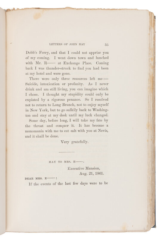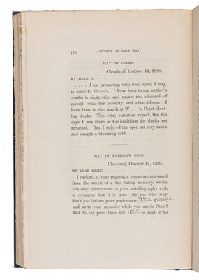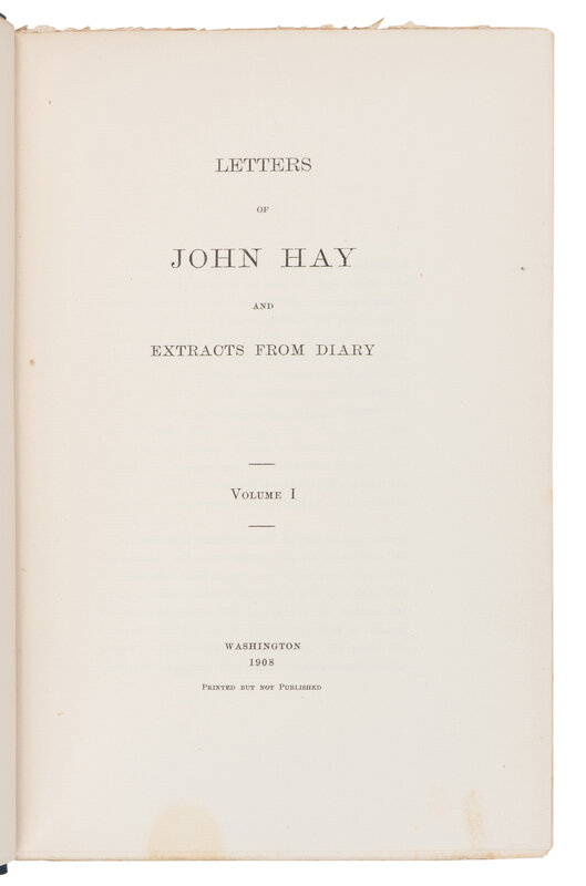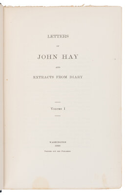 [LINCOLN, Robert Todd (1843-1926), his copy]. -- HAY, John (1838-1905). Letters of John Hay and Extracts from Diary. Washington, D.C.: Clara S. Hay, 1908.
