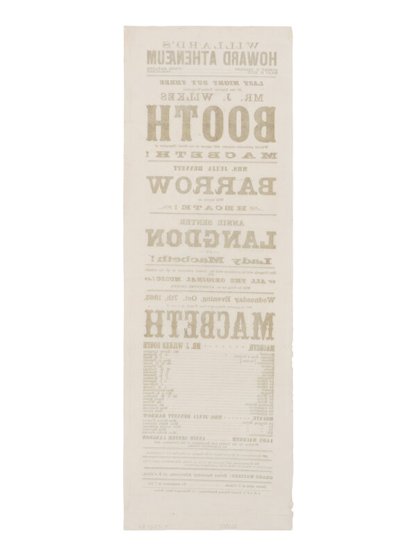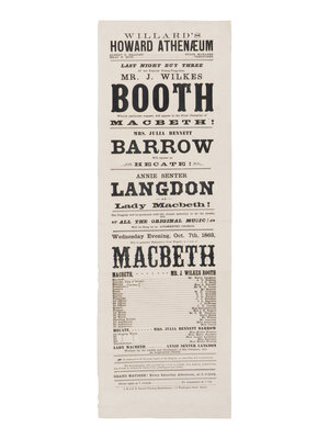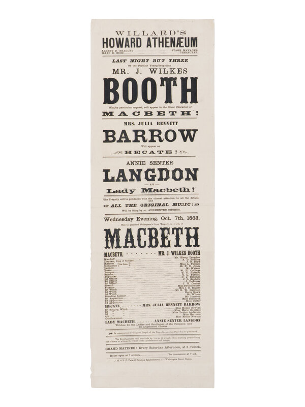 [BOOTH, John Wilkes (1838-1865)]. A broadside playbill for Booth's performance in the title role of Macbeth at the Howard Athenæum. Boston, 7 October 1863.