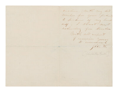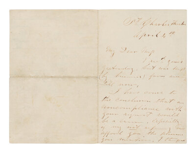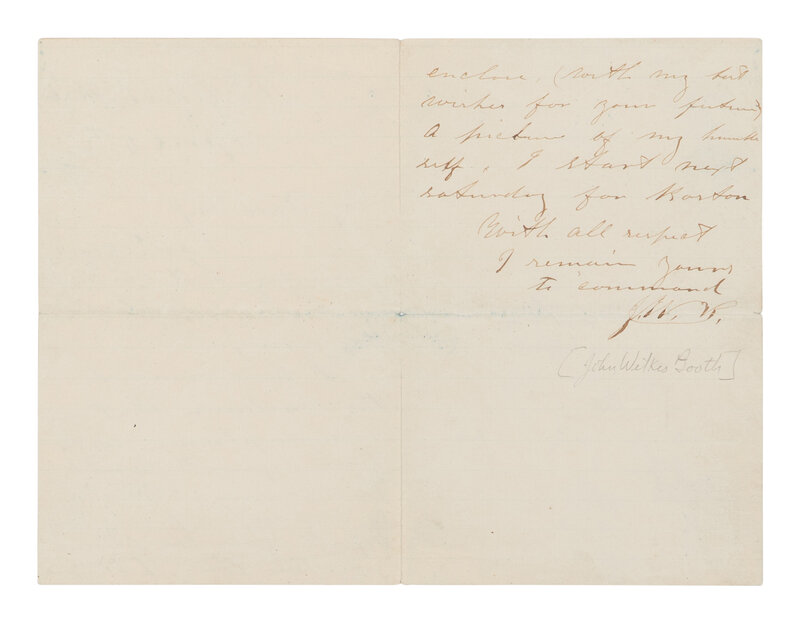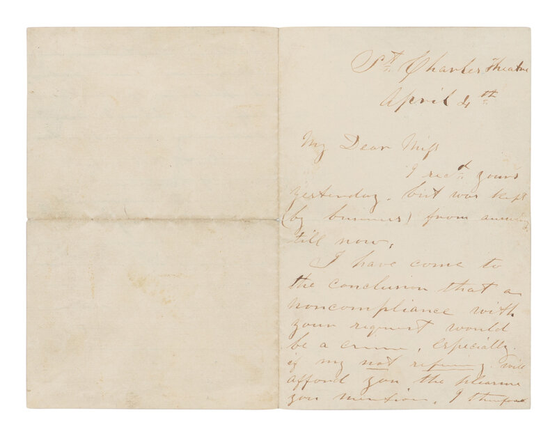 BOOTH, John Wilkes (1838-1865). Autograph letter signed ("J.W.B") to "My dear miss" from the St. Charles Theater, New Orleans, 4 April [1864].