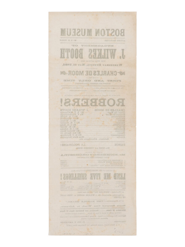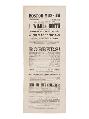[BOOTH, John Wilkes (1838-1865)]. A broadside playbill for Booth's performance as Charles de Moor in The Robbers at the Boston Museum, 11 May 1864.