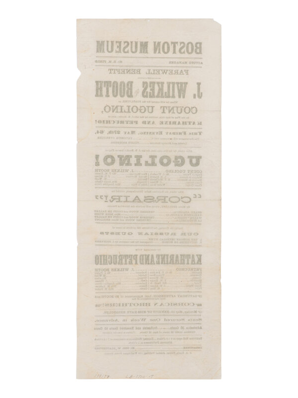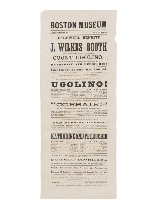 [BOOTH, John Wilkes (1838-1865)]. A broadside playbill for Booth's performance as Count Ugolino in the play of the same title at the Boston Museum, 27 May 1864.