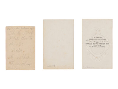 Each on original mounts. Largest, 4 x 2 1/2 in. Minor rubbing, wear along edges, inscription on verso of one CDV which reads, "This is the picture of The Man that Kiled Booth th old trater, he killed Lincoln."