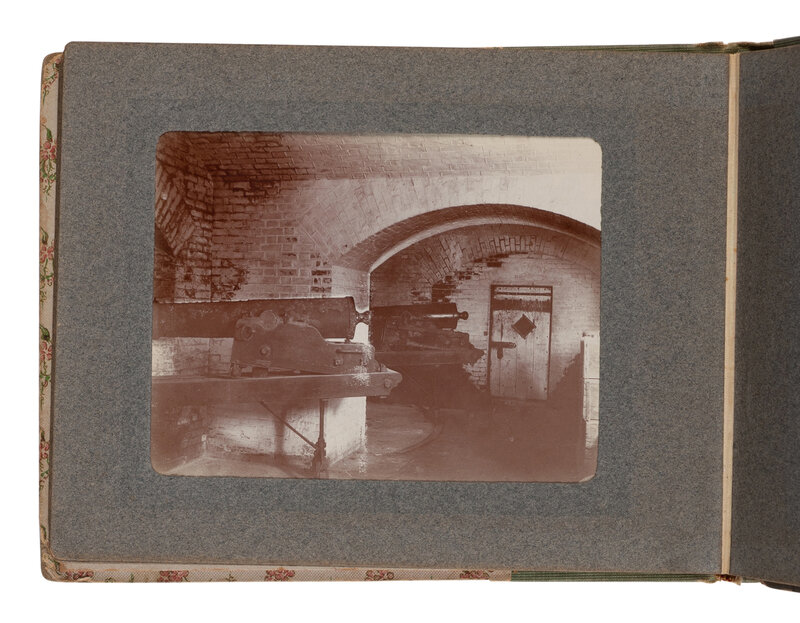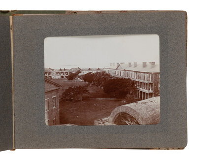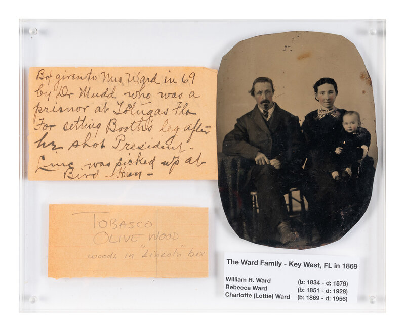 A note accompanying the box, with a half plate tintype of Ward and his family, reads, "Box given to Mrs. Ward in '69 by Dr. Mudd, who was a prisoner at Tortugas Fla for setting Booth's leg after he shot President Linc. was picked up at Bird Key." On the verso are the names "Bud Spangler" and "Sam Arnold," suggesting that all three prisoners worked on this box together. (A box of similar design and construction was previously sold through Cowan's Auctions in 2005 with a note inside identifying it as being the work of all three men.) The box descended through Ward's family, first to his daughter Charlotte (1869-1941) and then to Charlotte's daughter, Venice Kemp Hayes Christensen Kennison (1892-1964). Charlotte Ward married silent film actor Frank R. Hayes (1872-1923) in 1899, and the family moved to Los Angeles, California, in 1916.