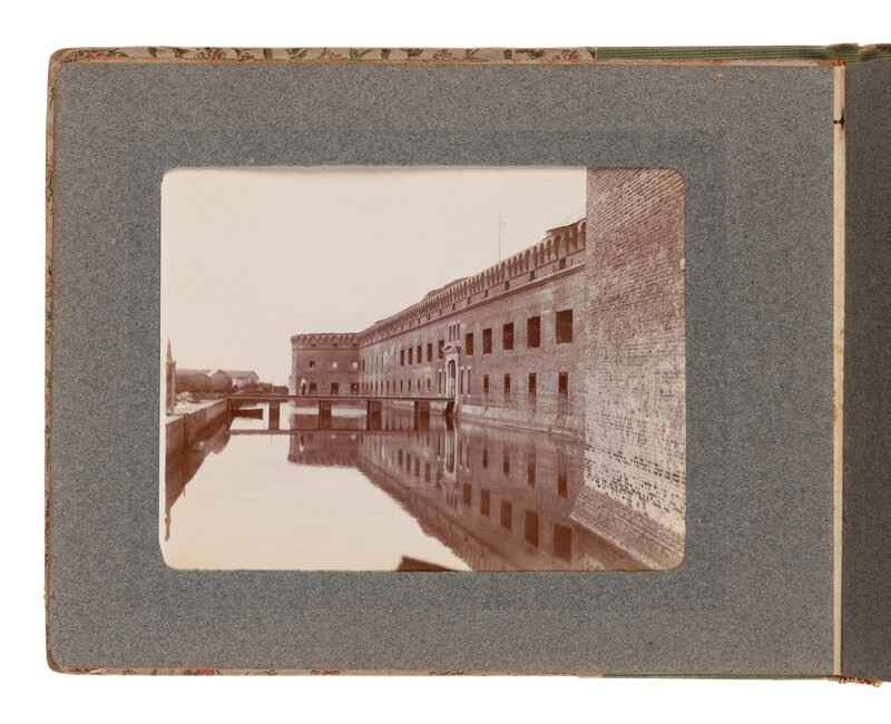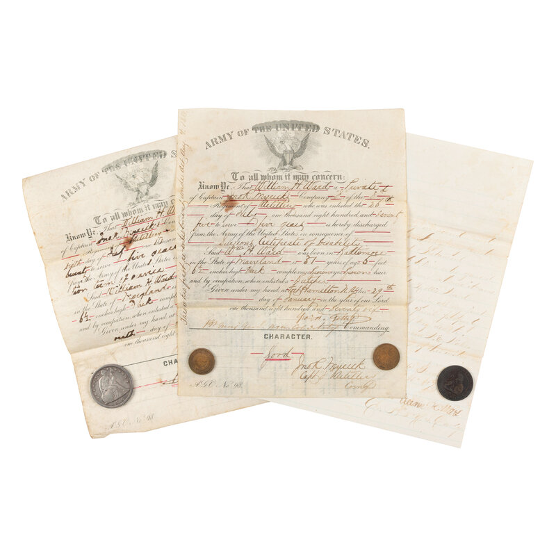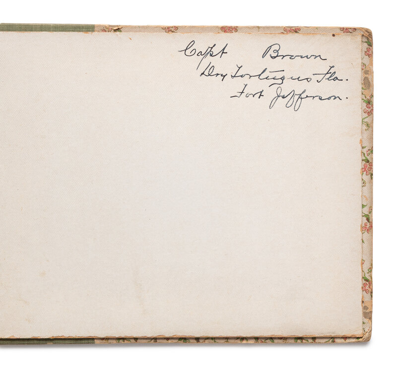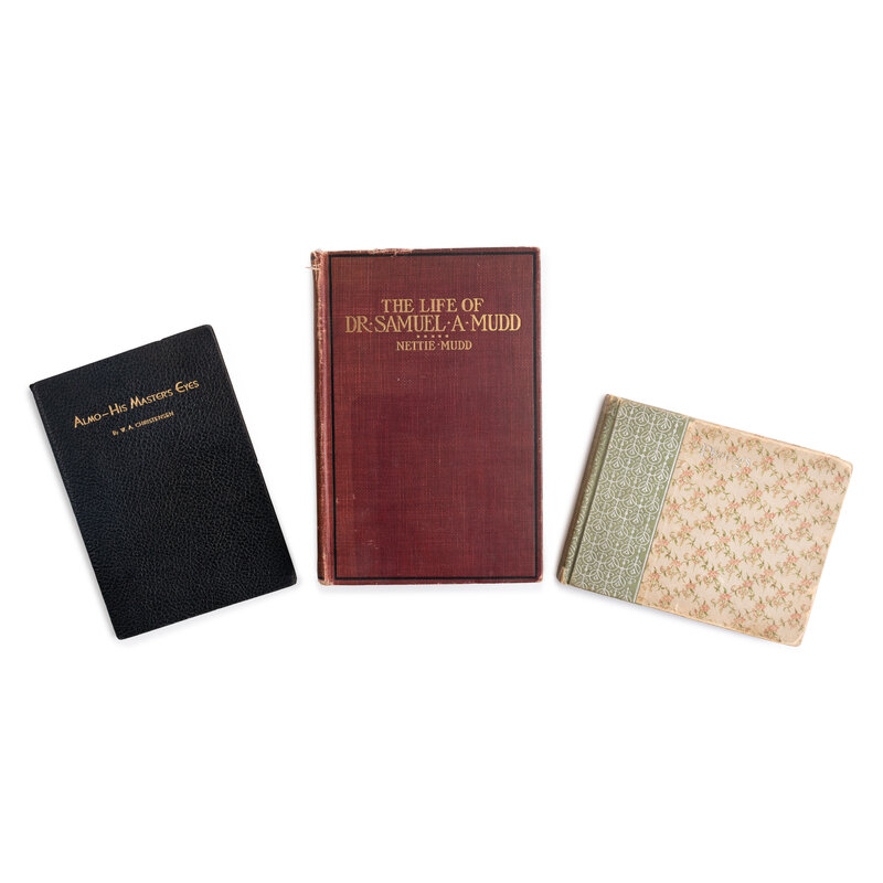 [With]: An extensive archive of materials related to the marquetry box constructed by Dr. Samuel Mudd during his imprisonment at Fort Jefferson, and the related provenance above, including: 1) A group of 3 vellum discharge documents related to William H. Ward's service in the United States Army, 1867-1875. -- 2) A manuscript document signed ("William H. Ward"), Fort Clark, Texas, 16 May 1879. Ward's last will and testament bequeathing all of his personal property to his daughter, Lottie Ward. -- 3) A group of 10 boudoir cards depicting various scenes of Fort Jefferson, ca late 19th century. -- 4) A small photo album with 13 snapshot photographs of various scenes at Fort Jefferson, including a view of Dr. Samuel Mudd's cell, ca early 20th century. Ownership inscription on rear pastedown of "Capt. Brown, Dry Tortugas, Fla. Fort Jefferson." -- 5) MONROE, Nettie Mudd (1878-1943). The Life of Dr. Samuel A. Mudd. New York and Washington: The Neale Publishing Co., 1906. Original red cloth gilt. -- 6) CHRISTENSEN, William A. (1885-1940). Typed letter to Cecil B. DeMille dated 4 May 1938, inquiring about the current address of Nettie Mudd Monroe. -- 7) [DEMILLE, Cecil B. (1881-1959)]. Typed letter on Cecil B. deMille Productions letterhead dated 11 May 1938, with current address of Nettie Mudd Monroe and signed by deMille's longtime secretary Gladys Rossen. -- 8) A group of newspaper clippings, books, etc. related to the above, neatly housed in a large binder.