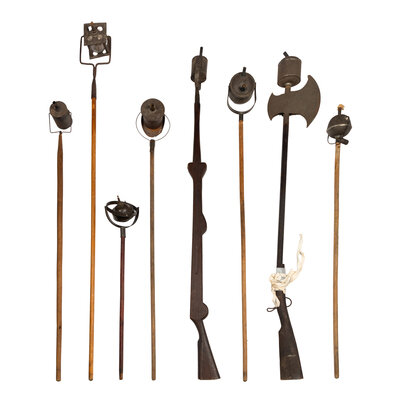 Tallest, approximately 73 in., most on contemporary wooden staffs, all appear unrestored and displaying wear commensurate with age and use. With a wooden stand.