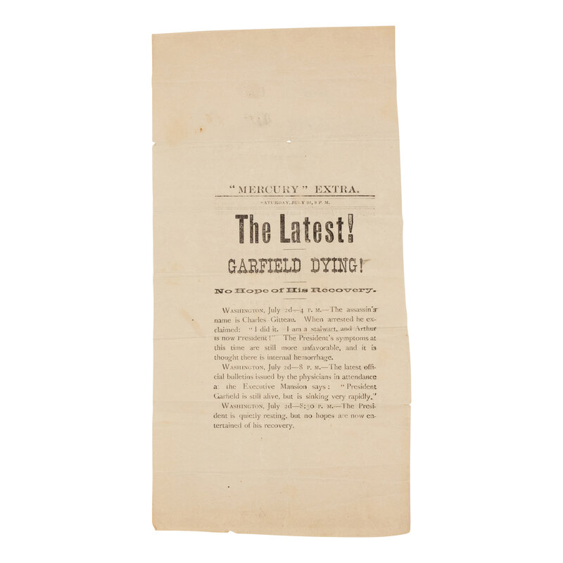 1) San Jose "Mercury" Extra. "The Latest! Garfield Dying!" No Hope of His Recovery." 2 July 1881. 11 x 5 1/2 in. Single column broadside describing Garfield's assassin Charles Guiteau and Garfield's condition.