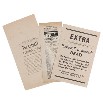 3) Fredericksburg Publishing Co., Inc. "President F.D. Roosevelt DEAD." 12 April 1945. 9 x 6 in. Single sheet bulletin which reads in full, "Our Nation's Chief Executive died this Afternoon, Thursday, April 12, 1945, of a Cerebral Hemorrage at Warm Springs, Ga., at the age of 63 years."