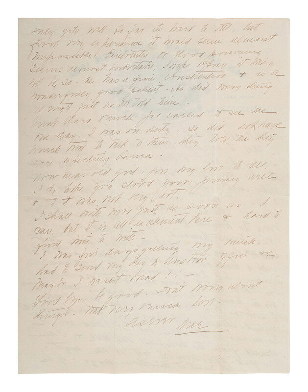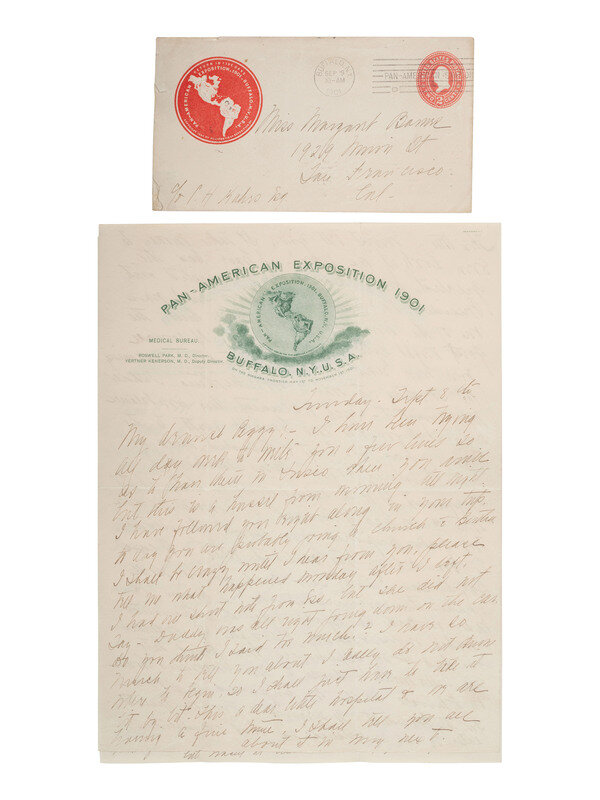 BARNES, Mary D. Autograph letter signed ("Mar") to "My dearest Peggy." [Buffalo, New York]. 8 September [1901]. 4pp., 8vo (267 x 203 mm), creasing at folds, light toning. On "Medical Bureau" stationery from "Pan-American Exposition 1901 / Buffalo N.Y. U.S.A." with accompanying "Pan-American Exposition" cover from the same year. Cover addressed to "Miss Margaret Barnes" at San Francisco, CA. Handstamped "Buffalo, N.Y. / September 9 / 1901."