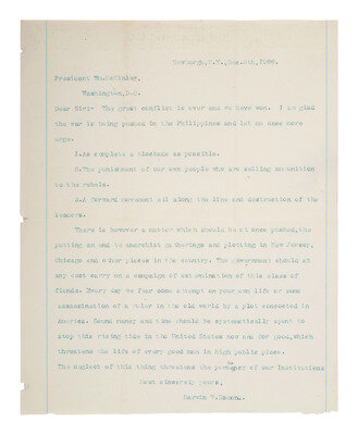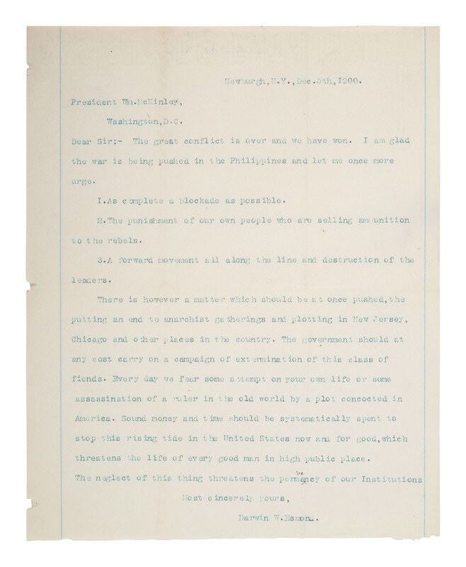 [With:] ESMOND. Darwin W. (1845-1923). Typed letter signed ("Darwin W. Esmond") in type. Addressed to President McKinley. Newburgh, New York. 5 December 1900. Esmond exhorts the president to put an end to anarchist gatherings and plotting in New Jersey, Chicago, and other places, noting "Every day we fear some attempt on your own life or some assassination of a ruler in the old world by a plot concocted in America...."