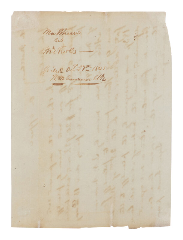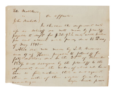 In full: "In this case the defendant sets up as set-off one note made by plaintiff payable to deft. for $20.93 1/2 cents with twelve per cent interest until paid, due 15th day of May 1841. Also one note made by T.N. Anderson and G.J. Hams, payable to plaintiff for forty dollars due on the 25th of December 1839, and assigned by the plaintiff to the defendant, and the makers of which note have been so far insolvent that a suit against them or either of them would have been unavailing."