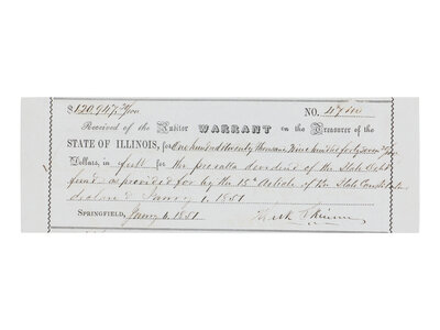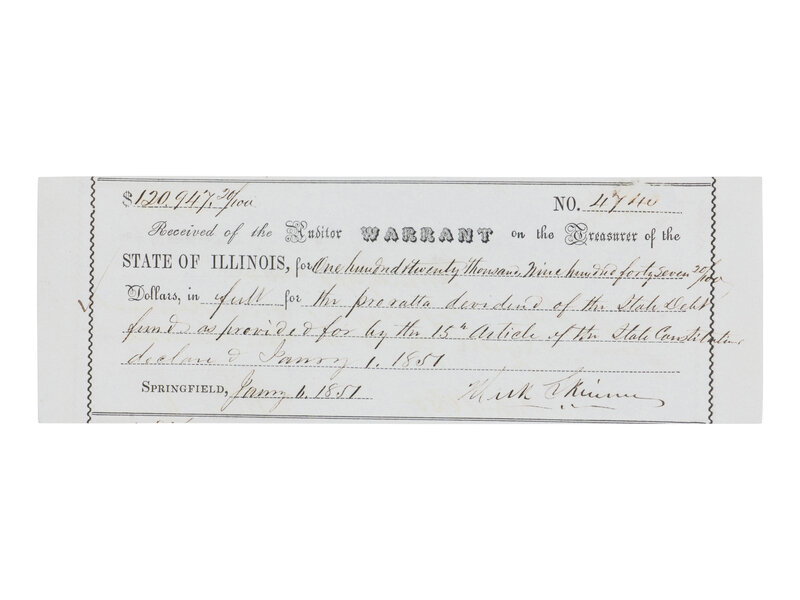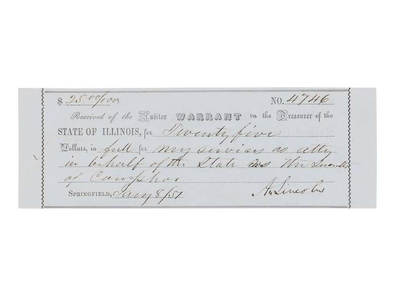 LINCOLN, Abraham (1809-1865). Partly printed warrant from Auditor's office signed ("A. Lincoln"), Springfield, 8 January 1851.