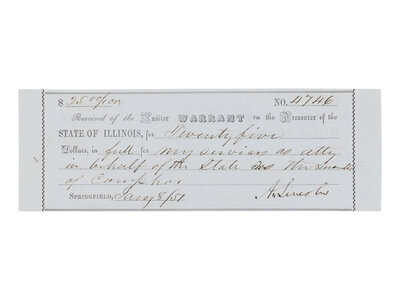 In full: "Received by the Auditor Warrant on the Treasurer of the State of Illinois, for twenty-five dollars, in full for my services as atty in behalf of the State on the Sureties of Camphor."