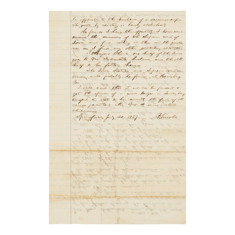 LINCOLN, Abraham (1809-1865). Autograph legal document signed ("A. Lincoln") in the case of Mary Fahnestock, Springfield, 20 July 1857.