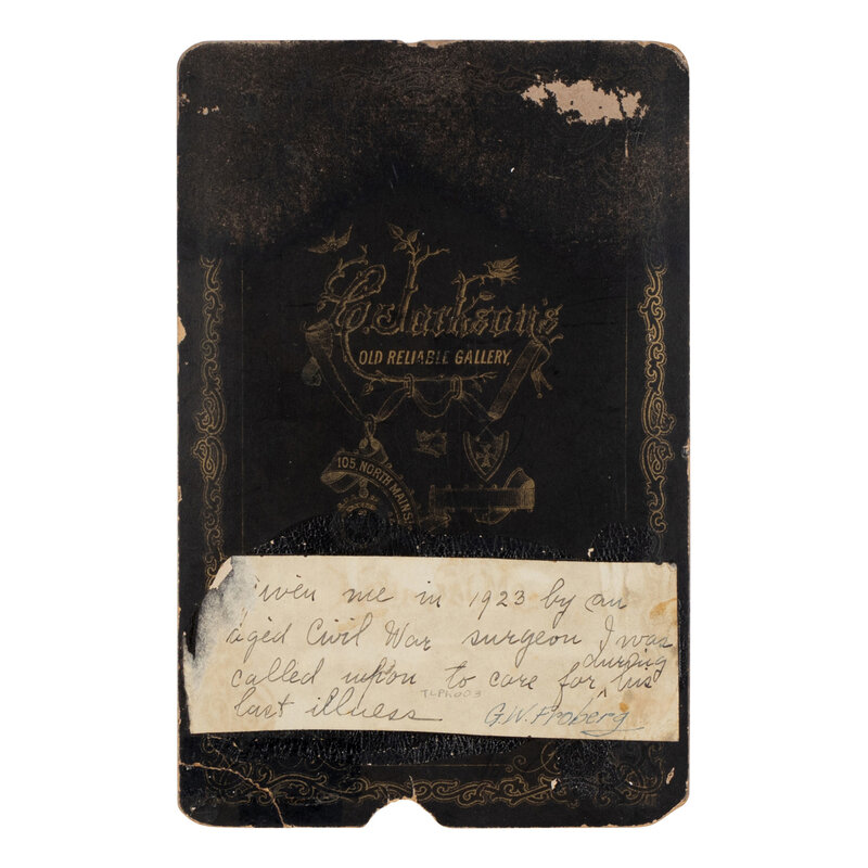 5 1/4 x 5 3/4 in. cabinet card on Jackson's original studio mount (staining to image and mount verso, mount chipped with loss near lower border, affecting imprint, light wear to edges). Provenance: G.W. Froberg (notation affixed to slip on verso: "Given [sic] me in 1923 by an aged Civil War surgeon I was called upon to care for during his last illness").