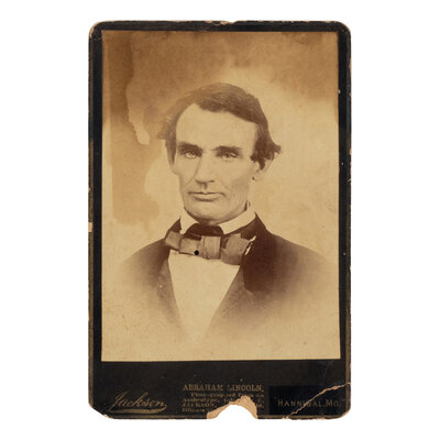 [LINCOLN-DOUGLAS DEBATES]. -- [JACKSON, Calvin (1820-1888), photographer]. A cabinet card photograph of a beardless Lincoln taken from an ambrotype, 1 October 1858 [but ca 1880s].