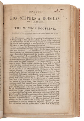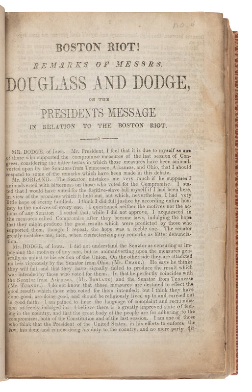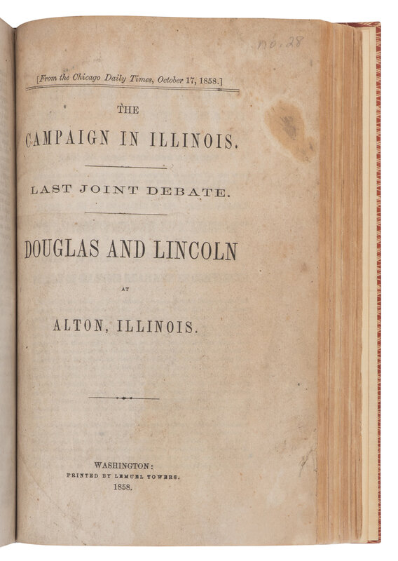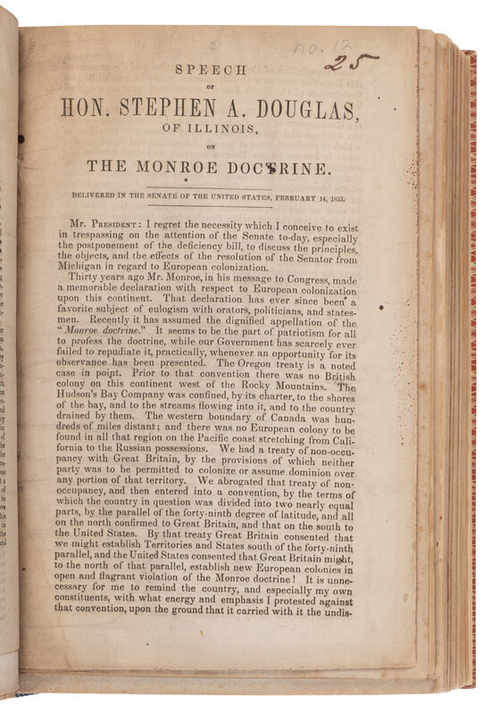 Speech of Mr. Douglass, of Illinois...on the bill to refund the fine imposed on General Jackson, at New Orleans. Washington, D.C.: Blair and Rives, 1844. -- Speech of Hon. S.A. Douglas, of Illinois, on the War with Mexico, and the Boundary of the Rio Grande. Washington, D.C.: Congressional Globe Office, 1848. -- Speech of Mr. Douglas, of Illinois, in reply to Mr. Soule, relative to the public lands in California. Washington, D.C.: Congressional Globe Office, 1850. -- Boston Riot! Remarks of Messrs. Douglass and Dodge, on the Presidents message in relation to the Boston Riot. N.p., n.d. -- Speech of Hon. Stephen A. Douglas, of Illinois, on the Monroe Doctrine. N.p., 1853. -- The Campaign in Illinois. Last Joint Debate. Douglas and Lincoln at Alton, Illinois. Washington, D.C.: Lemuel Towers, 1858. Monaghan 10. -- And others. Together, 42 works in one volume, 8vo. (Occasional staining and spotting, a few leaves repaired.) 20th century cloth-backed boards, top edges gilt.