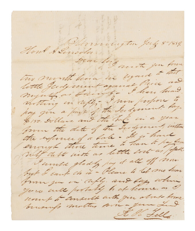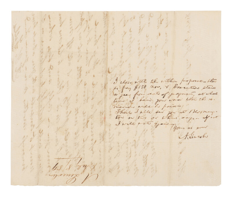In full: "I close with the within proposal - that in pay $150 now, and Execution [stayed] a year from date of judgment, at which time I have your word that the remainder will be paid. Think I will see you at Bloomington in two or three days. If not I will write again. Yours as ever, A. Lincoln."