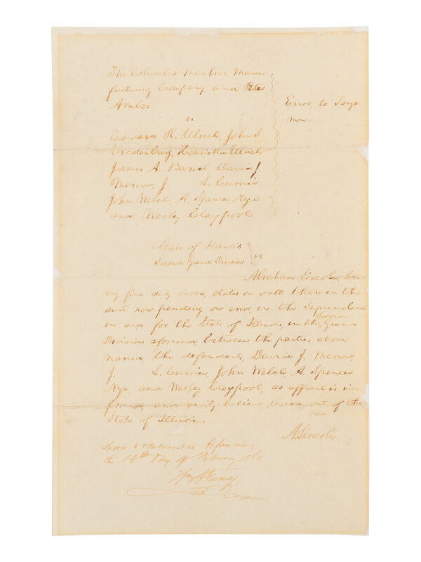 In part: "Abraham Lincoln, having first duly sworn, states on oath that in the suit now pending our error, in the Supreme Court in and for the State of Illinois, in the Second Grand Division aforesaid, between the parties above named, the defendant, David J. Mennow, J.S. Currier, John Welch, A. Spencer Nye, and Wesley Claypool, as affiant is informed, and verily believe, reside out of the State of Illinois."