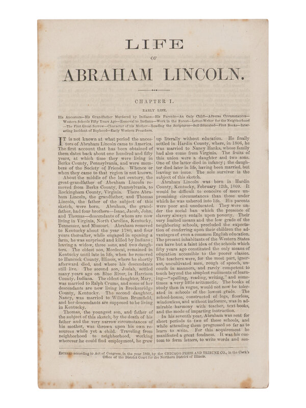 EXCEEDINGLY RARE: According to Fish's Lincoln Bibliography, not more than 6 copies are known. The last copy we could trace on the market appeared in Midland’s dealer catalogue in 1937. An even earlier appearance at auction was in Anderson Galleries’ 1907 sale of books from the Library of William H. Browne.