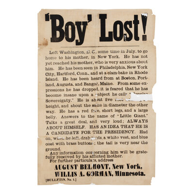 Full text: "Left Washington, D.C. some time in July, to go home to his mother, in New York. He has not yet reached his mother, who is very anxious about him. He has been seen in Philadelphia, New York City, Hartford, Conn., and at a clam-bake in Rhode Island. He has been heard from at Boston, Portland, Augusta, and Bangor, Maine. From some expression he has dropped, it is feared that he has become insane upon a subject he calls "Popular Sovereignty." He is about five feet [text missing] height, and about the same in diameter the other way. He has a red face, short legs, and a large belly. Answers to the name of 'Little Giant.' Talks a great deal, and very loud; ALWAYS ABOUT HIMSELF. HAS AN IDEA THAT HE IS A CANDIDATE FOR THE PRESIDENCY. Had on, when he elft, drab pants, a white vest, and blue coat with brass buttons; the tail is very near the ground. Any information concerning him will be gratefully received by his afflicted mother." EXCEEDINGLY RARE: According to online records, this is the only copy extant.