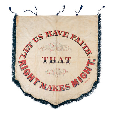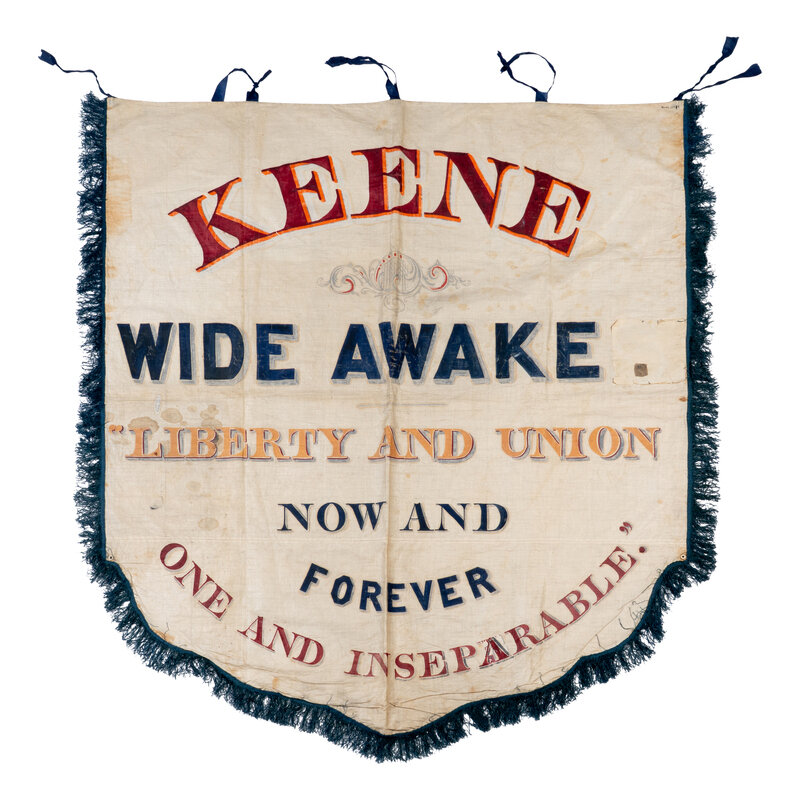 47 x 42 in. shield-shaped silk banner, hand-painted and double-sided, blue fringe along edges, silk ties at top edge at corners, eyelets at corners. The obverse reads: "Keene Wide Awake. 'Liberty and Union Now and Forever One and Inseparable.'" The reverse bears a quotation from Lincoln’s Cooper Union Address (1860): "'Let Us Have Faith that Right Makes Might.' A. Lincoln."
