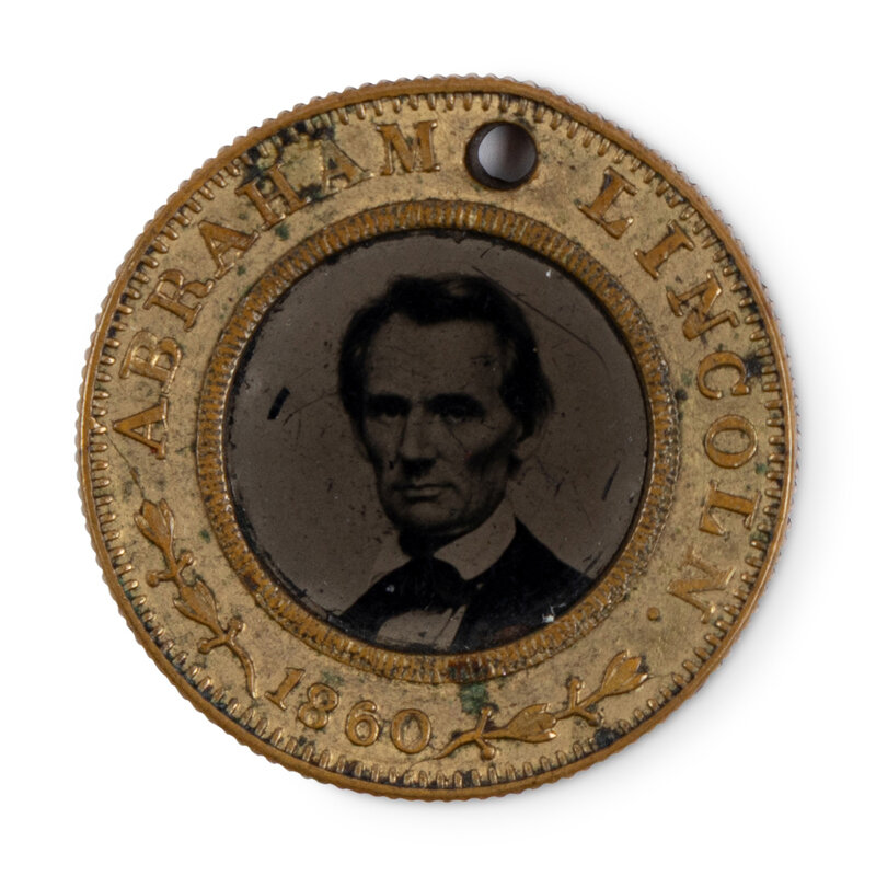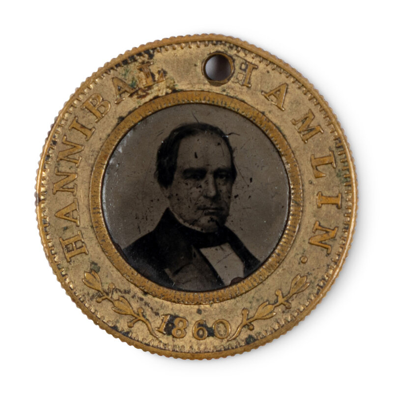 Back-to-back campaign token with obverse featuring a ferrotype portrait of Abraham Lincoln set in a metallic frame reading, "Abraham Lincoln / 1860" and reverse featuring a ferrotype portrait of Hannibal Hamlin set in a metallic frame reading, "Hannibal Hamlin. / 1860". Hole punched in frame. Overall diameter 1 in. (25 mm). Frame with scattered soiling and minor nicks; portraits retain good clarity, with occasional spotting and minor imperfections.