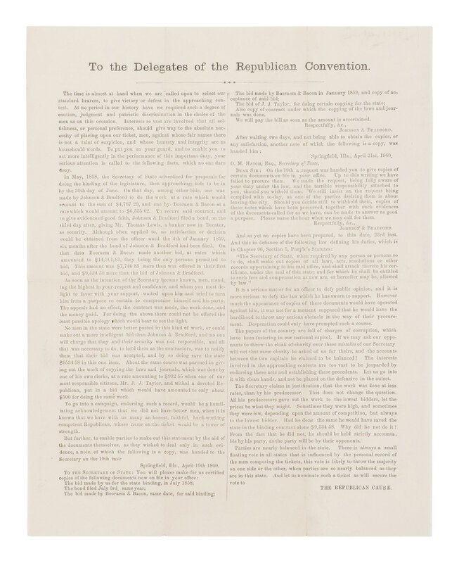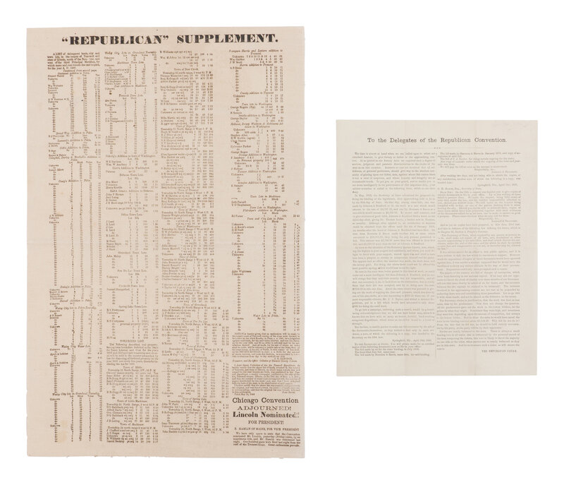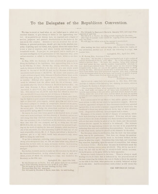 [With]: To the Delegates of the Republican Convention. [Springfield.: N.p.], 19 April 1860. 10 3/4 x 8 1/2 in. printed broadside in two columns. (Old folds).