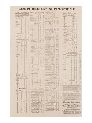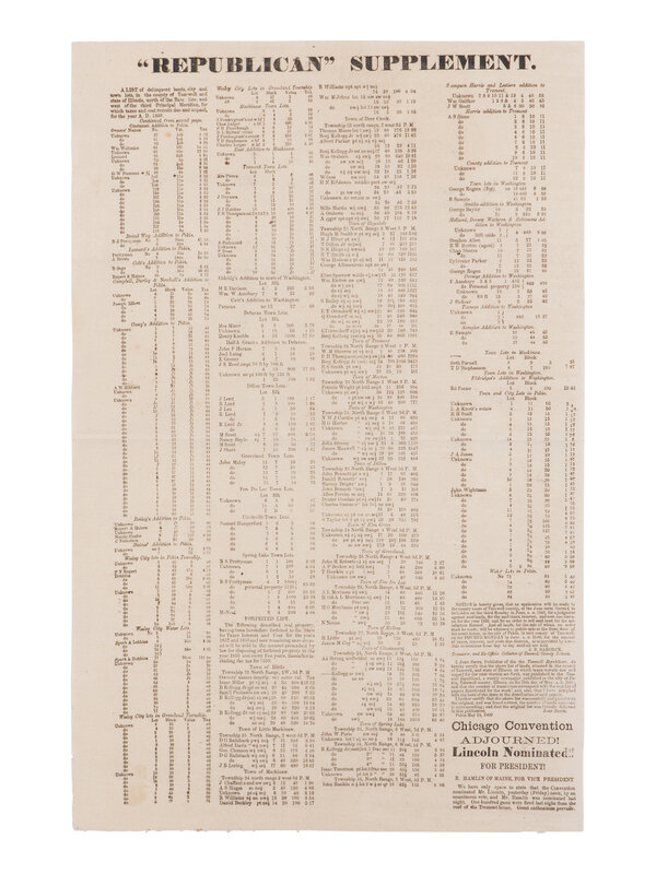 [LINCOLN-HAMLIN CAMPAIGN]. "Republican" Supplement...Chicago Convention Adjourned! Lincoln Nominated!! For President! [Pekin, IL]: Tazewell Republican, ca 19 May 1860.