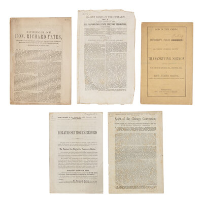 YATES, Richard. Speech...Delivered at the Republican Ratification Meeting, of the Citizens of Sangamon County, in the Hall of the House of Representatives, Springfield, June 7th, 1860. [Springfield?]: s.n., 1860. Disbound. Monaghan 93. -- Salient Points of the Campaign. No. 1. A Tract Issued by the Ill. Republican State Central Committee. [Springfield: s.n, 1860]. Disbound. Monaghan 27 (this being a variant). -- [LINCOLN, Abraham]. Horatio Seymour's Record. Chicago: Rand McNally, [1861]. Lincoln is quoted on pp.10-11. -- WHITE, James, Rev. God in the Crisis. Infidelity, False, Prophecy, and Slavery Coming Down. A Thanksgiving Sermon, delivered in the M.E. Church, Lincoln, Ill., August 6, 1863. Springfield: Baker & Phillips, 1863. Original wrappers. -- Chicago Tribune Campaign Document, No. 1. Spirit of the Chicago Convention. Extracts from all the Notable Speeches Delivered in and out of the National "Democratic" Convention. Chicago: Chicago Tribune, [1864]. Disbound.