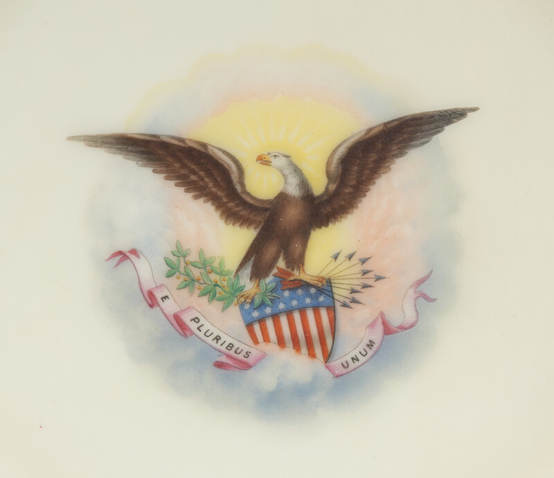 Upon her arrival at the Executive Mansion on 4 March 1861, Mary Lincoln was appalled to find the building in a state of complete disarray, with broken furniture, peeling wallpaper, and the china purchased less than a decade earlier during the Franklin Pierce administration reduced to just enough plates, cups, saucers, and serving dishes to be used by ten people. Two months later, she traveled to New York City on a purchasing trip to completely redecorate the Lincoln family's new home. On 15 May, Mrs. Lincoln and her entourage visited the shop of E. V. Haughwout, who showed her a "specimen plate" he'd designed for Franklin Pierce depicting an American bald eagle gripping a shield with a ribbon emblazoned with the national motto "E pluribus unum" floating atop a puff of delicately-painted clouds. Thrilled with the design, Mary Lincoln asked for a few minor changes, notably that the eagle's face be turned towards the left rather than the right and that the color be changed from the royal blue originally envisioned for Franklin Pierce to the more fashionable "solferino" color. In total, 666 pieces of Solferino china were ordered for the White House, totaling $3,195. This set was notable for being the first ever chosen by a First Lady.
