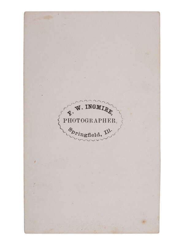 Frederick Ingmire (1822-1876) immigrated to the United States from England in 1831 and settled in New York as a Baptist minister. His exploration of photography began as a source of additional income, but he ultimately moved to Springfield, Illinois, where he opened his own photography studio. Ingmire's studio was in the same building as Abraham Lincoln's law office. The two men apparently became acquainted in 1861 when the president-elect, having made the difficult decision to leave the family dog behind in Springfield, brought Fido to the studio for a formal portrait session.