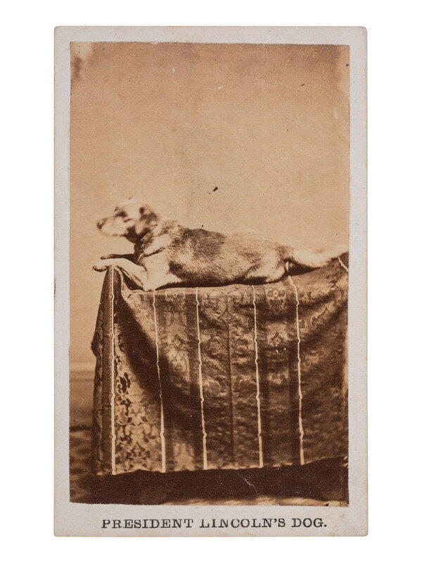 CDV on cardstock mount with caption printed in lower margin, "President Lincoln's Dog." The presidential pet, named Fido, is shown in repose on a draped table. Verso with imprint of F.W. Ingmire, Springfield, Illinois.