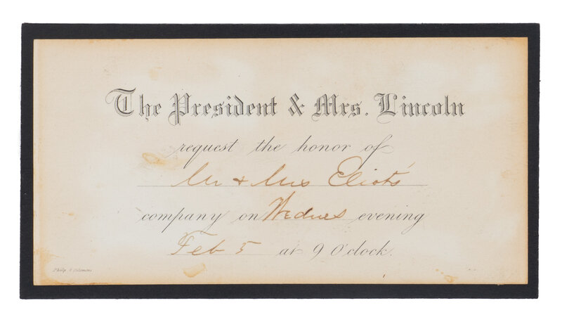 Narrow oblong 32mo (140 x 76 mm), mounted on black card, accomplished in manuscript by Mary Todd. Issued to Congressman Thomas Dawes Eliot of Massachusetts and his wife, Caroline.