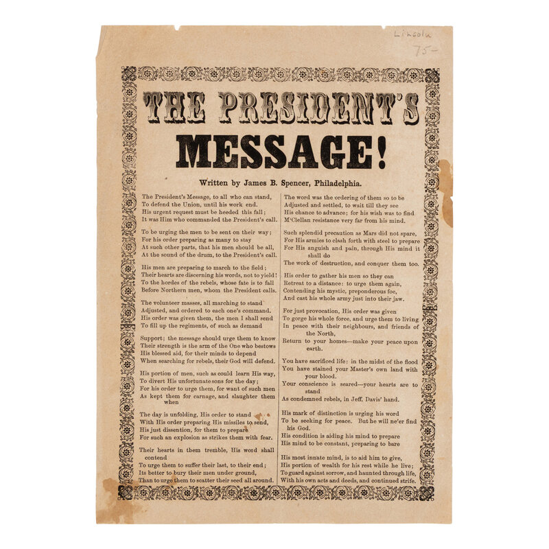 [LINCOLN, Abraham (1809-1865)]. SPENCER, James B. "The President's Message!" Philadelphia, ca 1862.