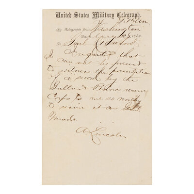 [LINCOLN, Abraham (1809-1865)]. Telegraph message to General Samuel W. Crawford in a surrogate hand, Washington, D.C. 28 August 1863.