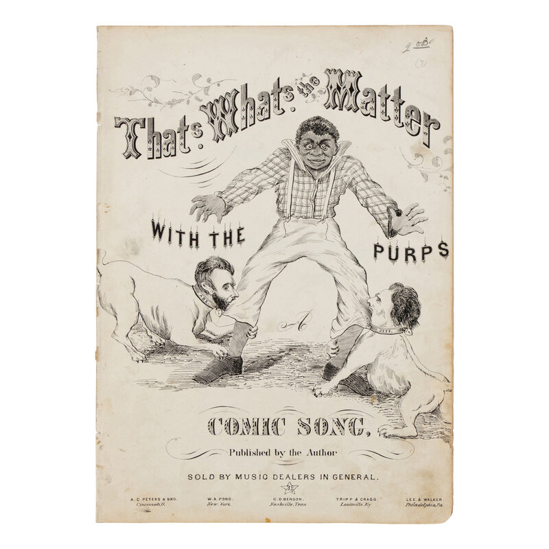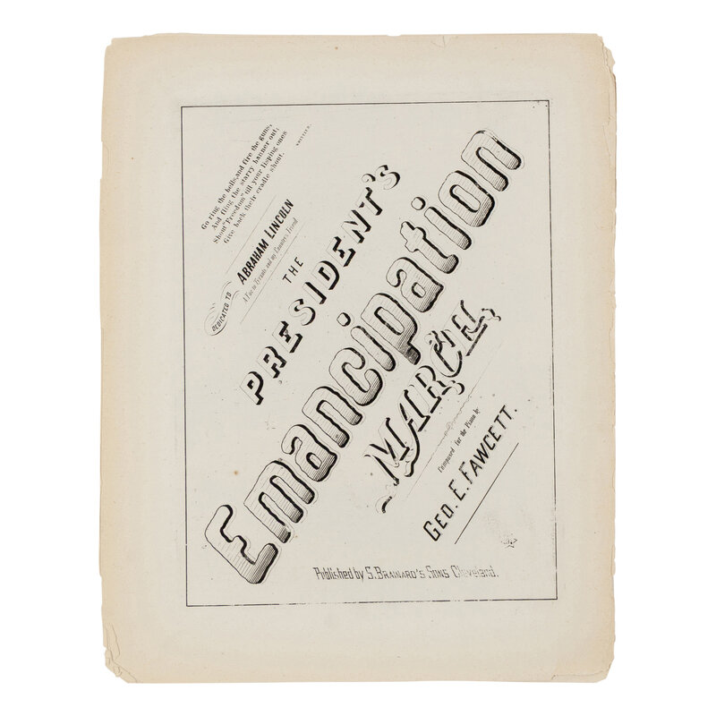 FAWCETT, George E. The President's Emancipation March. Cleveland: S. Brainard's Sons, 1862. Folio. (Pages disbound, chipping to extremities, minor losses to corners.) -- That's What's the Matter with the Purps. Louisville: Tripp & Craig, 1863. 4to. (Minor soiling, spine partially rubbed away, remnants of previous mounting to rear.)