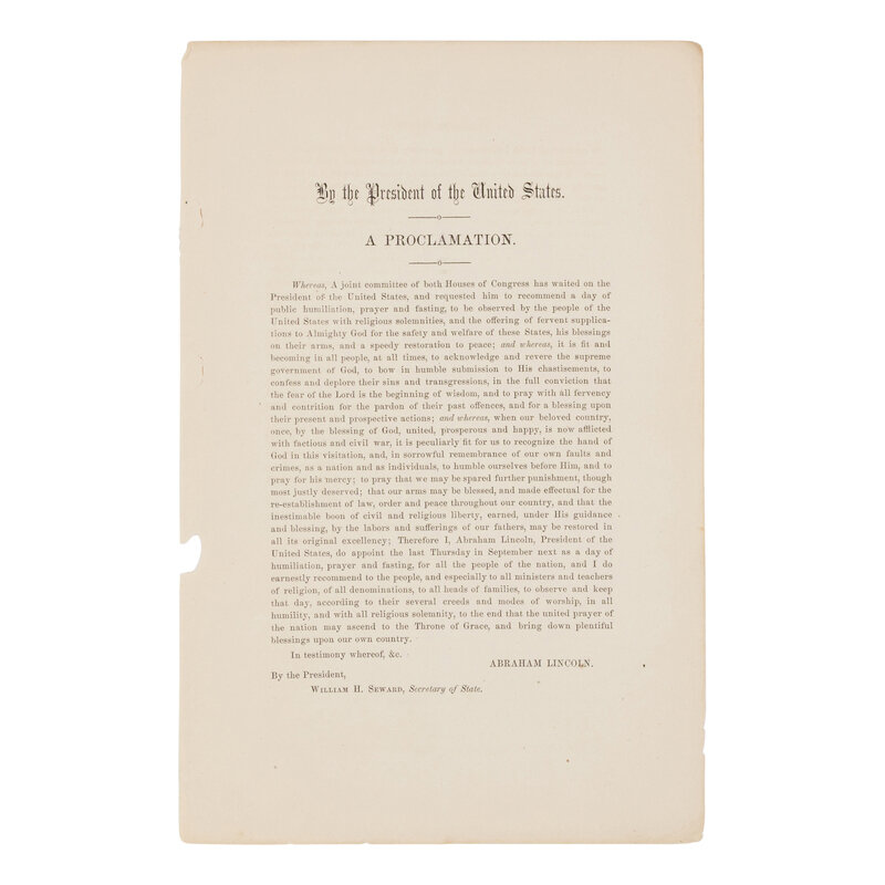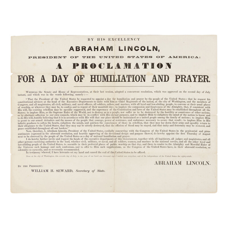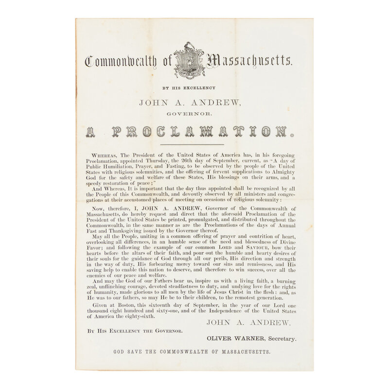 A Proclamation for a Day of Humiliation and Prayer. [Washington, D.C.], July 1864. 18 x 14 in. printed broadside (Lacking upper portion addressed from the governor of the issuing state, minor discolorations and losses along folds.) -- By the President of the United States, A Proclamation. [Washington: n.d.]. 9 1/4 x 6 in. printed broadside. (Minor marginal loss, corner loss.) -- [ANDREW, John A. (1818-1867)]. A Proclamation. [Boston:] N.p., 16 September 1861. 15 x 9 3/4 in. printed broadside. (Minor discolorations and losses along folds.)