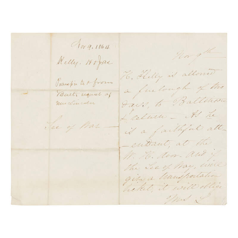 In full: "H. Kelly is allowed a furlough of two days, to Baltimore and return, as he is a faithful attendant at the W.H. door. And if the Sec of War will give a transportation ticket, it will oblige."