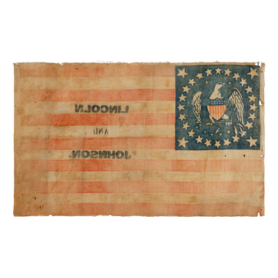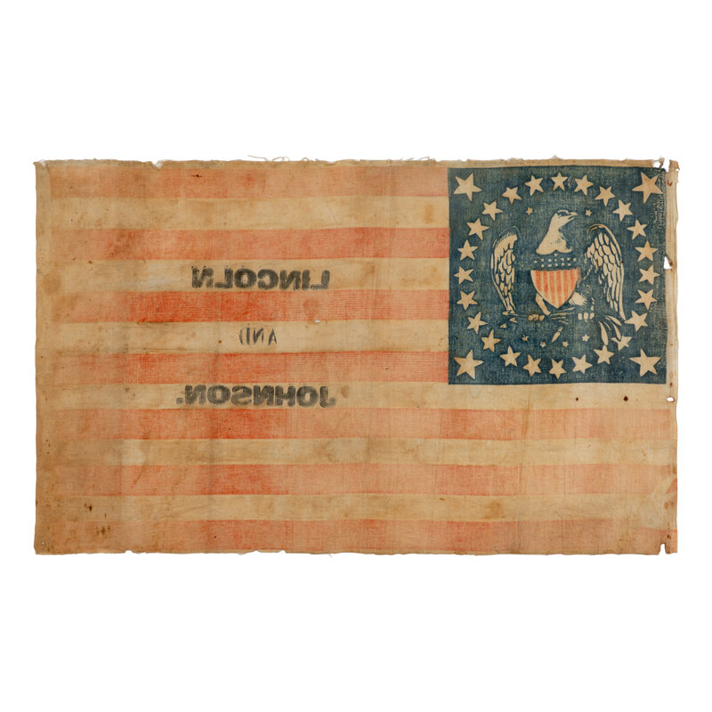 25 3/4 x 16 1/2 in. flag, paint-printed on cotton, wreath surrounding large eagle and colored shield, flanked by a star in each corner, printed with the words "Lincoln and Johnson."