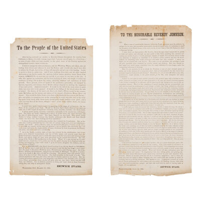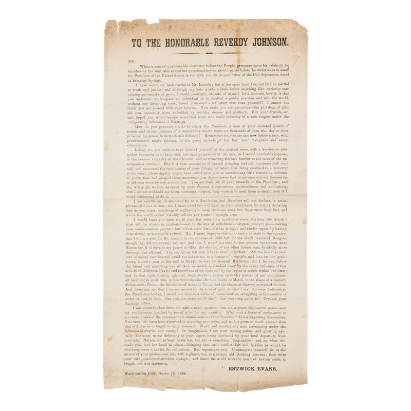 1) To the Honorable Reverdy Johnson. Washington City, 7 October 1864. 14 1/2 x 7 1/2 in. printed broadside. (Toning, marginal tears, spotting, folds, minor losses.) In part: "I have never, Sir, been partial to Mr Lincoln; but at the same time I cannot but be partial to truth and justice...I would...enquire of myself...how it is you undertake to lampoon an individual...who the world, without one dissenting voice, pronounce a far better man than yourself?"