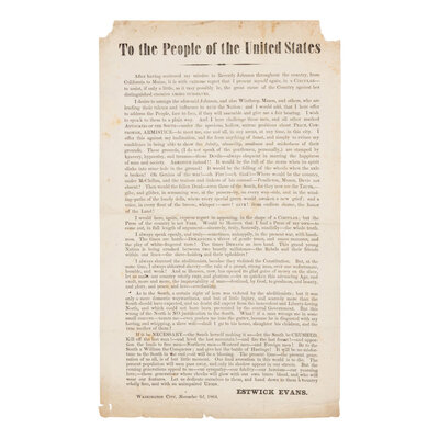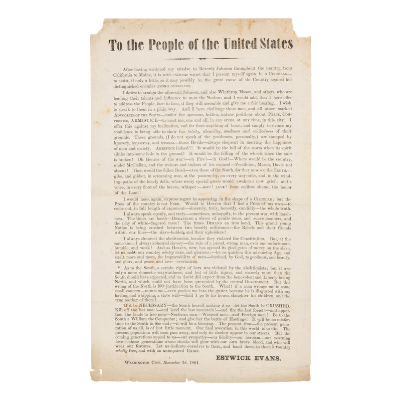 2) To the People of the United States. Washington City, 3 November 1864. 13 1/4 x 7 3/4 in. printed broadside. (Corner losses at upper portion, toning, minor creases, folds.) In part: "The times DEMAND an iron hand. This grand young Nation is being crushed between two beastly millstones - the Rebels and their friends within our lines - the slaveholders and their upholders!... The coming generations appeal to us... Let us dedicate ourselves to them, and hand down to them a country wholly free..."